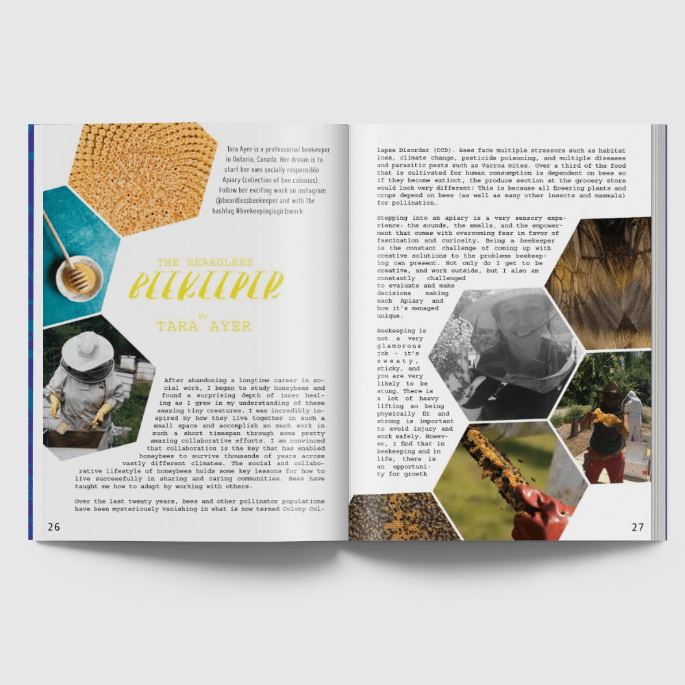I think that this layout is very interesting and well thought about because of the way it uses the topic of the article to influence its layout theming. The article is on Beekeeping so the images within this article are all shaped like honeycombs which is a very fun artistic detail used to enhance the articles layout. The way the title is placed on the left page really helps give it the attention it deserves by being surrounded by empty white space. It also has the most visual hierarchy of all the other text because it is the only piece of colored type, it has a unique font and it is the largest size. I like how the images are laid out on the spread, the asymmetry created and the weight distribution helps the title breath on the left hand page and helps the body text fill up the white space on the right. I like how the text is wrapped around the pictures but leaves enough space for a border to be placed around the images. This gives attention to the images while also helping sperate the text in a interesting way.