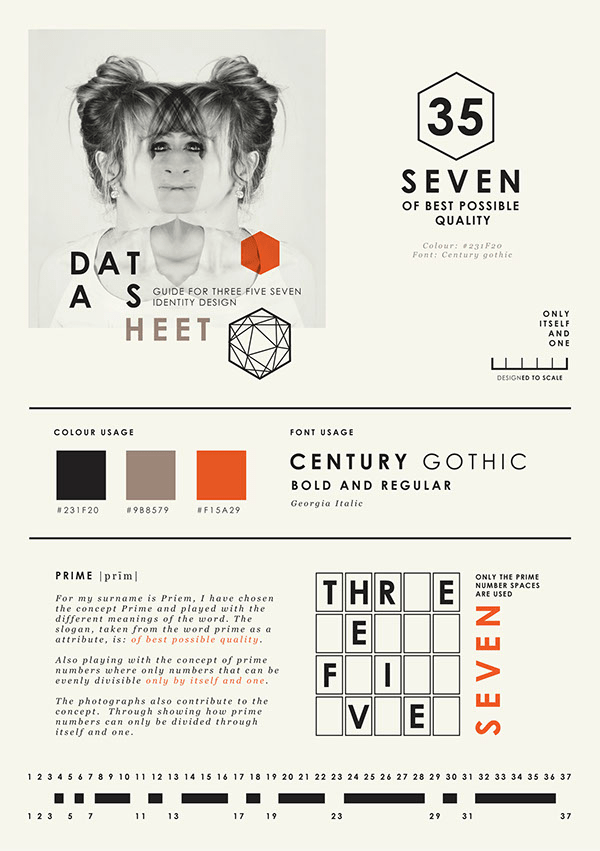 she decided to focus on the concept of “Prime” and use its different meanings to give life to the design. prime numbers are a constant idea here. the non-prime numbers are eliminated and only prime numbers are used. Trough this elimination, a pattern is formed, this pattern becomes a design element.The photographs also contribute to the concept. Through showing how prime numbers can onlybe divided through itself and one. Not only is this design very cohesive, but it has a complex message behind it. its meaningful its simple and very organized. I personally really like it.